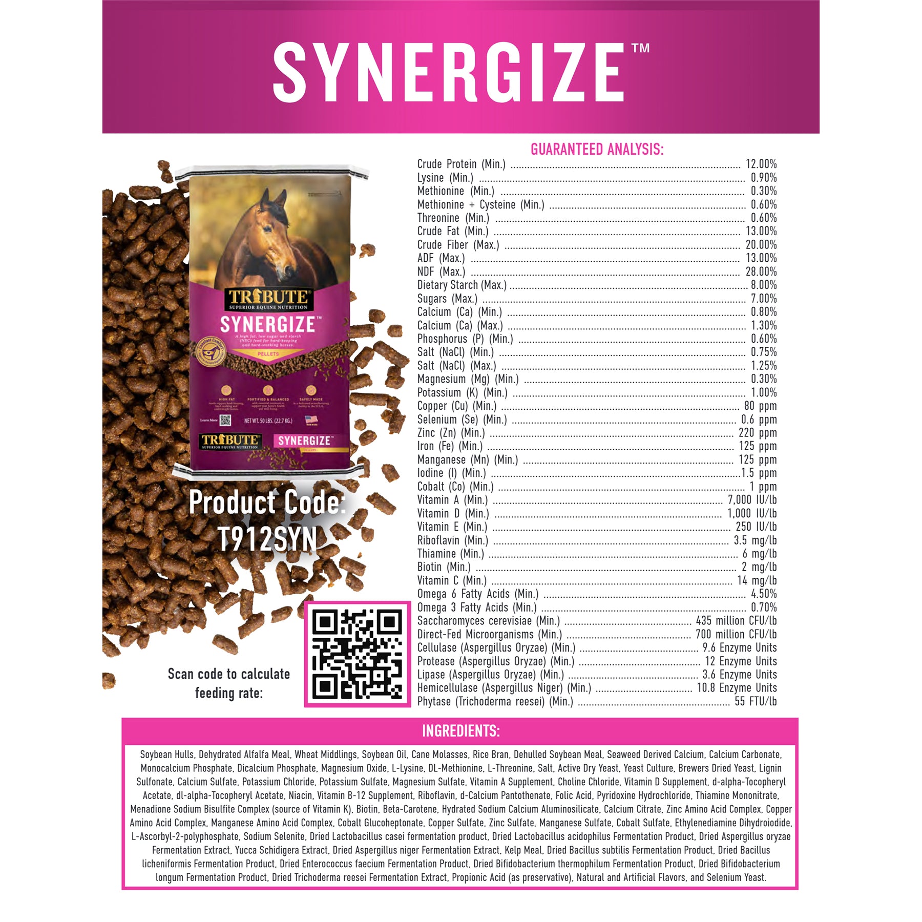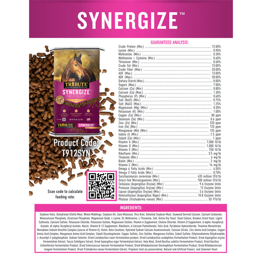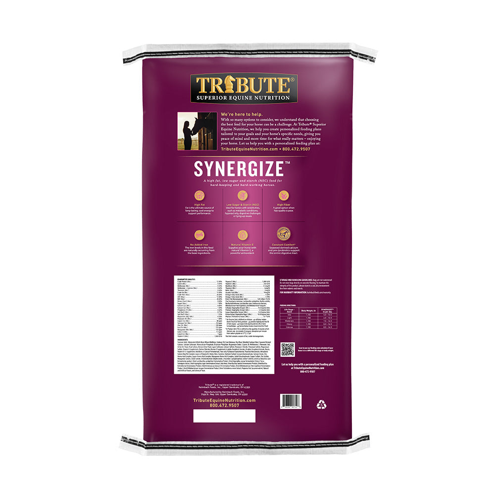 New and improved! Synergize is a high fat (13%), low sugar and starch (NSC) horse feed for hard-keeping and hard-working horses. This feed is fortified with Constant Comfort®, a premium seaweed derived calcium that promotes a healthy gastric pH to support horses at risk of ulcers and digestive upset, and now, Uptake Technology™, a powerful blend of ingredients that improve nutrient absorption! Learn more here!