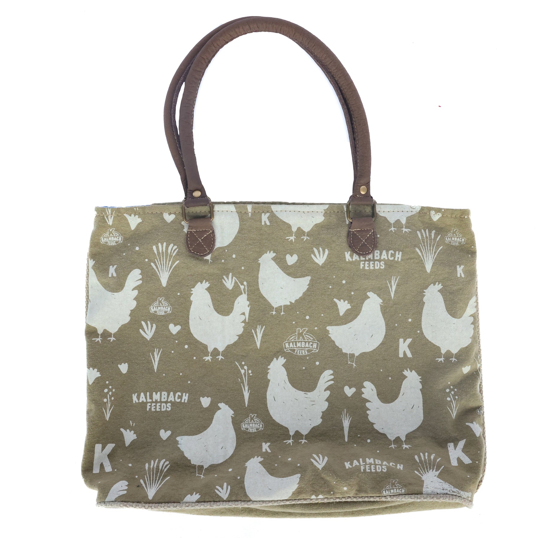 For the Chicken Mama Who Does It All. Whether you're gathering eggs, chasing littles, or heading to the store, this custom Kalmbach tote has your back—literally. With a playful chicken print, cozy canvas and leather feel, it's cute and coop-ready. Equal parts farm flair and everyday function—because your bag should work as hard (and look as good) as you do.