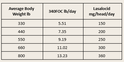 Hand feed daily to provide 1mg. of Lasalocid per 2.2 lb of body weight up to a maximum of 360 mg/head/day.