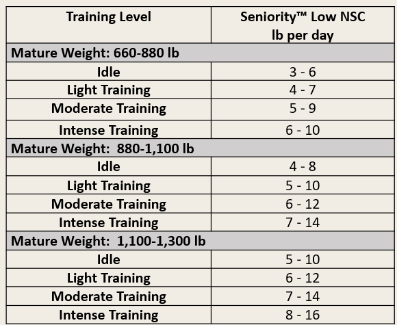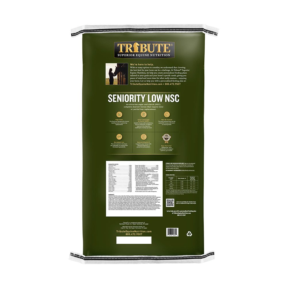 Seniority™ Low NSCcan be used as a complete feed when hay is in short supply or unavailable. May feed up to 2% of your horse’s body weight of Seniority™ Low NSC per day, but divide into at least 4 feedings per day. Do not feed more than 5 pounds of any horse feed per feeding.