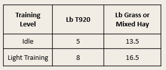 The above recommendations are based on an 1100 lb. horse. Amounts of grain and hay may need to be adjusted depending on weight and condition of individual horses. Free choice salt and clean, fresh water should be available.